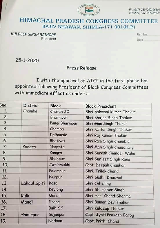 हिमाचल प्रदेश कांग्रेस कमेटी के प्रदेश के 36 ब्लाकों में अध्यक्षों की नियुक्त कर दी है। प्रदेश कांग्रेस अध्यक्ष कुलदीप राठौर ने इसकी सूची जारी कर दी है।