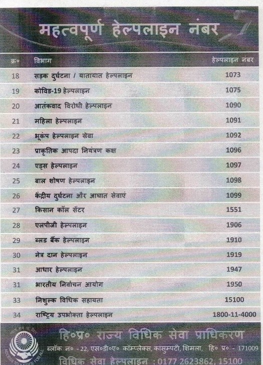 17 दिसंबर। जिला विधिक सेवाएं प्राधिकरण सोलन ने राज्य विधिक सेवाएं प्राधिकरण द्वारा जारी किए गए विभिन्न आपातकालीन हेल्पलाइन नम्बरों की सूची जारी की है। यह जानकारी जिला विधिक सेवाएं प्राधिकरण की सचिव गुरमीत कौर ने दी।