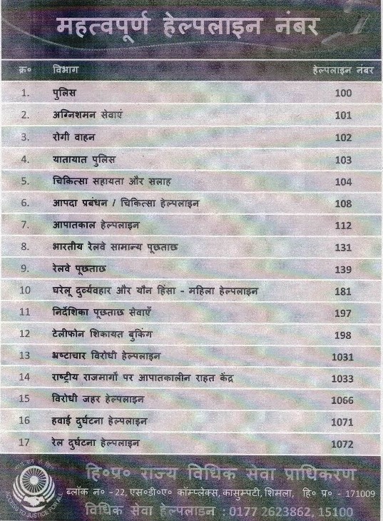 17 दिसंबर। जिला विधिक सेवाएं प्राधिकरण सोलन ने राज्य विधिक सेवाएं प्राधिकरण द्वारा जारी किए गए विभिन्न आपातकालीन हेल्पलाइन नम्बरों की सूची जारी की है। यह जानकारी जिला विधिक सेवाएं प्राधिकरण की सचिव गुरमीत कौर ने दी।