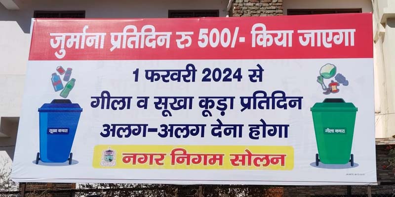 इसके लिए दिनों के हिसाब से पूरे हफ्ते को बांट दिया गया है, हालांकि इस प्रकार का फरमान करीब दो साल पहले भी नगर निगम जारी कर चुकी है, लेकिन पहले नगर निगम इस मामले को लेकर कुछ ही दिनों तक सख्त रही है। परंतु अब स्वच्छता सर्वेक्षण में पिछड़ने के बाद नगर निगम ने इस मामले को लेकर सख्ती अपनाने का निर्णय लिया है। 1 फरवरी के बाद यदि अब लोग गिला व सुख कूड़ा अलग-अलग नहीं देंगे तो उन पर जुर्माना किया जा सकता है और इसको लेकर नगर निगम सोलन ने प्रचार आरंभ कर दिया है । शहर के विभिन्न हिस्सों में बड़े-बड़े बोर्ड लगाकर इस प्रकार की जानकारी दी जा रही है । इससे पहले नगर निगम ने खुले में कूड़ा फेंकने वालों के खिलाफ सख्ती अपनाते हुए 1000 रुपए जमाने का प्रावधान किया था और कई लोगों के खुले में कूड़ा फेंकने पर चालान भी किए थे जिसके बाद काफी हद तक यह समस्या सुलझ पाई है । अब नगर निगम ने स्पष्ट किया है कि यदि कोई भी व्यक्ति जिला व सुख कूड़ा अलग-अलग नहीं देगा तो उसका चालान किया जाएगा यह चलन 500 रुपए प्रतिदिन तय किया गया है। वहीं मामले में नगर निगम की मेयर ऊषा शर्मा ने कहा कि 1 फरवरी के बाद गिला व सुखा कूड़ा अलग अलग लिया जाएगा। ऐसा न करने वालों के चालान भी किए जाएंगे।