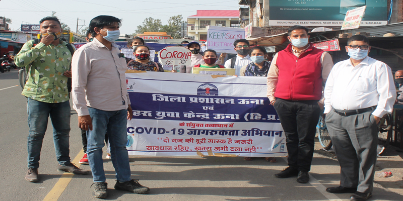 25 मार्च। नेहरु युवा केंद्र ऊना द्वारा जन–जन को कोरोना से बचाओ मुहिम के अंतर्गत नेहरु युवा केन्द्र के स्वयंसेवकों तथा स्थानीय महाविद्यालय के एनएसएस स्वयंसेवियों द्वारा अम्ब बाजार में जागरूकता अभियान चलाया गया। इस अवसर डॉ. लाल सिंह जिला समन्वयक नेहरु युवा केंद्र ने बताया कि कोरोना एक बार फिर बढ़ रहा है, अतः किसी भी प्रकार की लापरवाही जानलेवा सिद्ध हो सकती है इसलिए समय रहते हर व्यक्ति को अनुशासन का पालन करना अति आवश्यक है तथा स्वास्थ्य विभाग एवं जिला प्रशासन द्वारा जारी किए जा रहे दिशा-निर्देशों का पालन करना चाहिए।