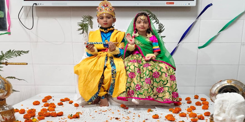 विद्यालय के नन्हे-मुन्ने बच्चों ने राधा-कृष्ण की वेशभूषा धारण कर सुंदर झाँकियाँ और प्रस्तुत कीं।