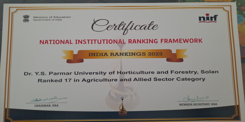 5 जून। डॉ. यशवंत सिंह परमार औद्यानिकी एवं वानिकी विश्वविद्यालय, नौणी ने देश में कृषि, औद्यानिकी विश्वविद्यालयों और संस्थानों की राष्ट्रीय रैंकिंग में पाँच स्थान का सुधार कर 17वां स्थान हासिल किया है।  विश्वविद्यालय ने भारत सरकार के शिक्षा मंत्रालय द्वारा जारी नेशनल इंस्टीट्यूशनल रैंकिंग फ्रेमवर्क (एन॰आई॰आर॰एफ॰) 2023 रैंकिंग में 17वां स्थान हासिल किया है जो वर्ष 2022 के लिए आई॰सी॰ए॰आर॰ द्वारा जारी की गई कृषि विश्वविद्यालयों की रैंकिंग में 5 स्थानों का सुधार है।