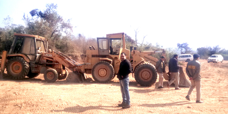 नालागढ के निकट खोखरा गांव जेसीबी चलाकर अवैध खनन करने के एक बड़े मामले का खुलासा हुआ है। खनन माफिया ने जहां जेसीबी मशीने लगाकर पहाड़ों को बूरी तरह से नोच डाला वहीं साथ लगती निजी व सरकारी भूमि को भी नहीं वकशा गया। पता चला है कि अवैध खनन की आड़ में सैंकड़ों खैर के पेड़ों को जड़ों समेत सफाचट्ट कर दिया गया। वन विभाग ने मौके से 2 जेसीबी मशीनों और 2 टिप्परों जब्त किया है। वहीं पुलिस, प्रशासन, वन विभाग और माईनिंग विभाग ने मौके पर पहुंचकर कार्रवाई आरंभ कर दी है। जांच में सामने आया है कि अवैध खनन का यह काम बिना किसी अनुमति के चल रहा था और लगभग 800 से 1000 टिप्पर मिट्टी और पत्थर के अवैध तरीके से चोरी कर लिए गए। अनुमति को लेकर अभी पुलिस और माईनिंग विभाग की जांच चल रही है। प्रशासन ने जमीन की निशानदेही तक खनन के काम को रोक दिया है। नालागढ़ के खोखरा गांव में अवैध खनन का मामला सामने आया है। जिसमें एक पीडि़त व्यक्ति ने आरोप लगाया था कि उसकी निजी भूमि को खनन माफिया ने तबाह कर दिया और साथ लगती भूमि को भी खनन से खतरा पैदा हो गया है।