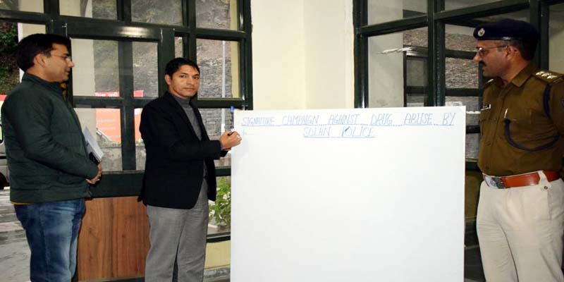 जिला पुलिस द्वारा जन-जन को नशाखोरी एवं नशा उन्मूलन की दिशा में जागरूक बनाने के लिए आज उपायुक्त कार्यालय सोलन के मुख्य द्वार पर हस्ताक्षर अभियान आरम्भ किया गया। अभियान का शुभारम्भ अतिरिक्त पुलिस अधीक्षक डाॅ. शिव कुमार शर्मा ने किया।