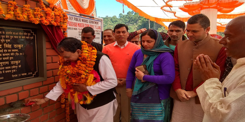 सिंचाई एवं जन स्वास्थ्य, बागवानी व सैनिक कल्याण मंत्री श्री महेन्द्र सिंह ठाकुर ने आज धर्मपुर विधानसभा क्षेत्र के अंतर्गत 5 लाख रूपये की लागत से निर्मित टिहरा से लग्यार सड़क का शुभारंभ, लगभग तीन करोड़ रूपये की लागत से टिहरा-मन्योह सड़क के सुधार कार्य का भूमि पूजन, 3 करोड़ 70 लाख रूपये की लागत से हियूण-नलयाणा सड़क के सुधार कार्य का भूमि पूजन, लगभग 4 करोड़ 30 लाख रूपये की लागत से पुराली से कूज्जाबल्ह सड़क के कार्य का भूमि पूजन तथा बक्कर खड्ड पर 3 करोड़ 44 लाख रूपये की लागत से निर्मित होने वाले पुल का षिलान्यास किया ।
