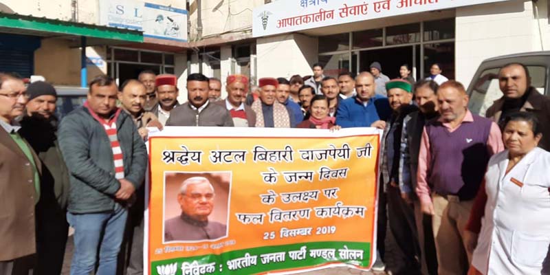 पूर्वप्रधान मंत्री अटल बिहारी वाजपेयी की जयंती पर बुधवार को भाजपा मंडल सोलन ने विभिन्न कार्यक्रम आयोजित किए। इस मौके पर सोलन अस्पताल में रोगियों को फल वितरित किए। भाजपा मंडल सोलन के पदाधिकारियों व कार्यकर्ताओं ने पूर्व प्रधानमंत्री को श्रद्धांजलि अर्पित की व उनके बताए मार्ग पर चलने का प्रण लिया। इस दौरान पूर्व सांसद वीरेंदर कश्यप, संजीव सूद, नरेंदर ठाकुर, भरत साहनी, कुमारी शीला, संजीव (बंटी) लक्ष्मी ठाकुर, डॉ धर्मचंद गुलेरिया, चन्दरकांत शर्मा, श्याम भटनागर उपस्थित रहे। यह जानकारी मीडिया प्रभारी नरेश गांधी ने दी।
