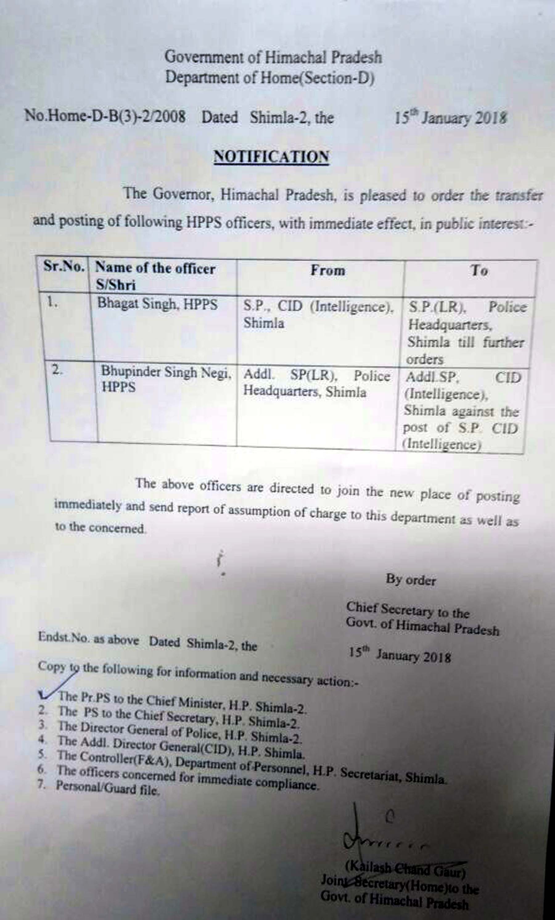 प्रदेश सरकार ने सोमवार को प्रदेश के 2 पुलिस अधिकारियों के तबादले किए है। एसपी सीआईडी भगत सिंह ठाकुर का तबादला किया है। उन्हें पुलिस एसपी (एलआर) पुलिस मुख्यालय लगाया गया है। जबकि उनके स्थान पर भुपेंद्र सिंह नेगी को एसपी सीआईडी लगाया गया है। नेगी वर्तमान में एएसपी (एलआर) पुलिस मुख्यालय में तैनात थे।