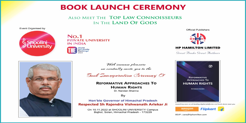 08 नवंबर कानूनी विज्ञान संकाय शूलिनी विश्वविद्यालय हिमाचल प्रदेश राज्य मानवाधिकार आयोग के सहयोग से मानवाधिकारों पर सुधारवादी दृष्टिकोण पर दो दिवसीय अंतर्राष्ट्रीय सम्मेलन और एक पुस्तक विमोचन का आयोजन कर रहा है।