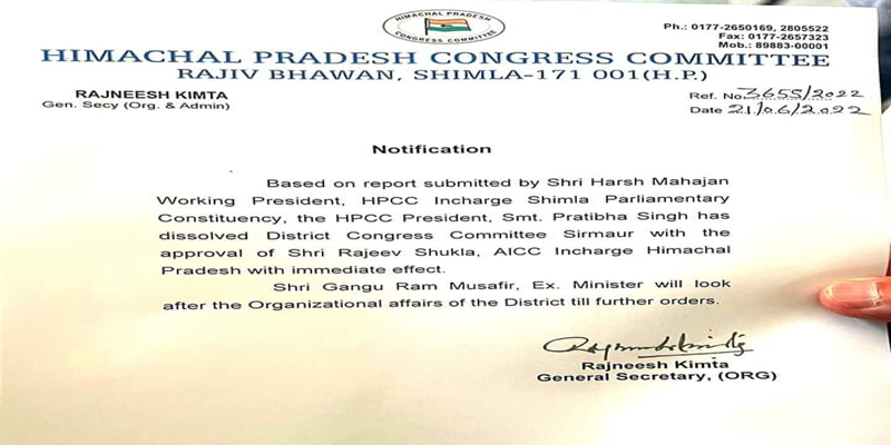 सिरमौर कांग्रेस में विवाद पर पार्टी आलाकमान इन एक्शन, जिला कमेटी की भंग