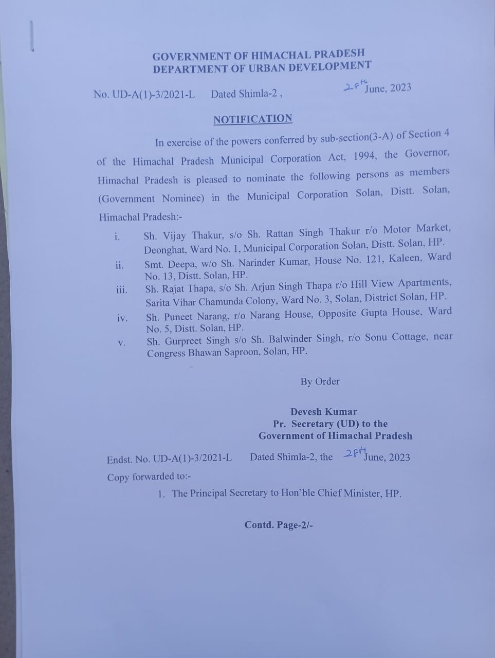 28 जून । सरकार ने सोलन नगर निगम में पांच पार्षदों को मनोनीत कर दिया है। इनमें वार्ड नंबर 1 से दो पार्षद मनोनीत किए गए है। जिससे साफ लग रहा है कि कांग्रेस एक नंबर वार्ड को सबसे ज्यादा मजबूत बनाने में जुट गई है। वार्ड नंबर 1 से विजय ठाकुर व गुरप्रीत सिंह उर्फ प्रिंस को पार्षद मनोनीत किया गया है। इनमें से प्रिंस मुख्यमंत्री सुखविंदर सिंह सुक्खू के करीबी लोगों में से एक हैं। जबकि वार्ड 13 से दीपा को मनोनीत किया गया है। दीपा नरेंद्र कुमार की धर्मपत्नि है। जिन्होंने इस वार्ड से कांग्रेस के उम्मीदवार के तौर पर चुनाव लड़ा था। वे इस वार्ड में कांग्रेस के सक्रिय कार्यकर्ता है। वार्ड तीन से रजत थापा उर्फ मांटू को पार्षद मनोनीत किया गया है। जबकि वार्ड 5 से पुनीत नारंग उर्फ बादल को पार्षद मनोनीत किया गया है।