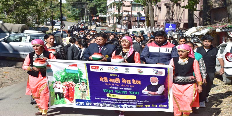 21 अक्तूबर। नेहरु युवा केंद्र सोलन  के सौजन्य से शेड्स कोलज, चंबाघाट में मेरी मट्टी मेरा देश कार्यक्रम के तहत खंड स्तरीय अमृत कलश यात्रा तथा मेरी मट्टी मेरा देश कार्यक्रम का आयोजन किया गया। कार्यक्रम मे कर्नल संजय शांडिल मुख्य अतिथि रहे. इस कार्यक्रम के तहत कलश यात्रा शेड्स कालजे से चम्बाघाट तक निकली गई. कलश यात्रा के पश्चात कालजे में विभिन्न जगह से आई मिटटी को मिलाया गया तथा राज्य स्तर पर भेजने के लिए नेहरु युवा केंद्र के राष्ट्रीय युवा स्वयंसेवियो को ये कलश सोपे गए।  कार्यक्रम के दौरान नेहरु युवा केंद्र सोलन को तरफ से रंगारंग सांस्कृतिक कार्यक्रम भी प्रस्तुत किया गया। शेड्स कालजे तथा एन एस एस के छात्रों ने देशभक्ति के नारों के साथ वीरो व देश की मिट्टी को नमन किया तथा दुसरे लोगो को भी देशभक्ति की भावना से ओतप्रोत किया। नेहरु युवा केंद्र सोलन से श्री अनुराग यादव ने सभी को पंच प्रण की सपथ दिलवाई। कार्यक्रम में डाक विभाग, एन एस इस, तथा नेहरु युवा केंद्र के स्वयंसेवकों के साथ साथ लगभग 450 छात्रों ने भाग लिया।
