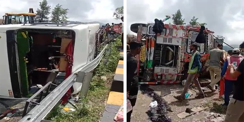 हाईवे पर ट्रक की ब्रेक फेल आगे जा रही बस को मारी टक्कर दोनों पलटें 25 घायल