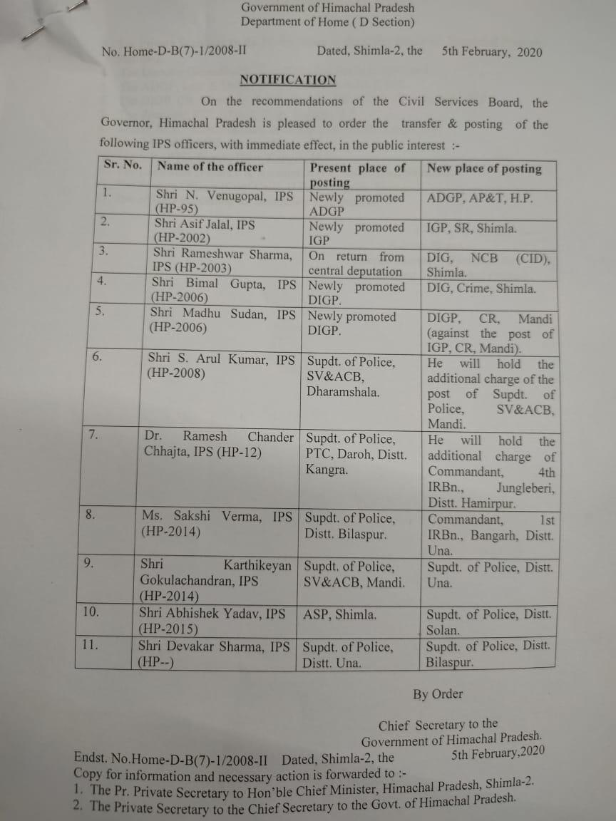सरकार ने बुधवार को हिमाचल प्रदेश पुलिस विभाग में 11 अधिकारियों को प्रमोशन दी है।सरकार ने सोलन के एसपी मधुसूदन शर्मा का प्रमोशन कर दिया है। उन्हें डीआईजी के प्रमोट किया गया है। जबकि अब उनके स्थान पर एएसपी शिमला के पद पर तैनात आईपीएस अभिषेक यादव को एसपी सोलन लगाया गया है। इसके अलावा पुलिस विभाग में अन्य अधिकारियों की भी प्रमोशन हुई है।