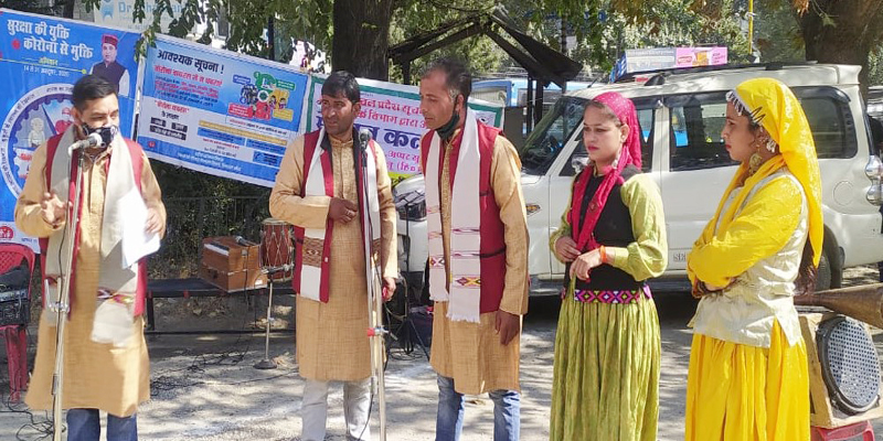 31 अक्तूबर। अंतरराष्ट्रीय कुल्लू दशहरा के अंतिम दिन स्वास्थ्य एवं परिवार कल्याण विभाग कुल्लू के सौजन्य से मन्नत कला मंच कुल्लू के कलाकारों ने ढालपुर टैक्सी स्टैंड में उपस्थित लोगों को कोरोना महामारी के बारे जागरूकता हेतु ‘सुरक्षा की युक्ति, कोरोना से मुक्ति’अभियान के तहत गीत,संगीत व नुक्कड़ नाटक से जानकारी दी। अभियान के तहत स्वास्थ्य विभाग द्वारा जिला में विभिन्न गतिविधियों का आयोजन किया जा रहा है जिसमें कोविड 19 के बारे विस्तृत व महत्वपूर्ण जानकारीयां दी जा रही हैं।